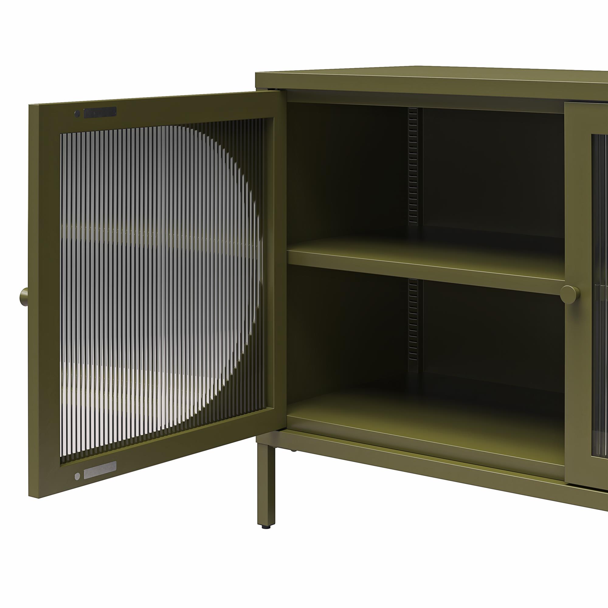 In need of a seriously cute accent cabinet to both modernize and organize your space? The Luna Collection is the perfect combination of storage with an elevated design that can solve your organization and style needs in one piece! The resilient metal construction really delivers in terms of versatility while the oval-shaped fluted glass doors add a distinguished charm to this dashing decorative cabinet. The Wide 2-Door Accent Cabinet provides two roomy shelves (one adjustable) so you can instantly streamline and organize your living space in a flash. Add style and much-needed storage to your living room, kitchen, den, bathroom, guest room, or really any room in the home!