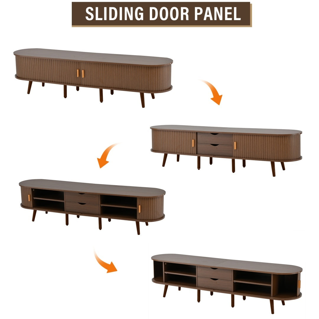 TV Stand With 2 Drawer 2 Sliding Doors 2 Tier Storage Shelf,Oval TV Cabinet Storage Sideboard With Rounded Corners For Livingroom Bedroom,175X40X42cm,Dark Oak,MDF,weight Capacity 30kg,for 70inch TV Furniture
